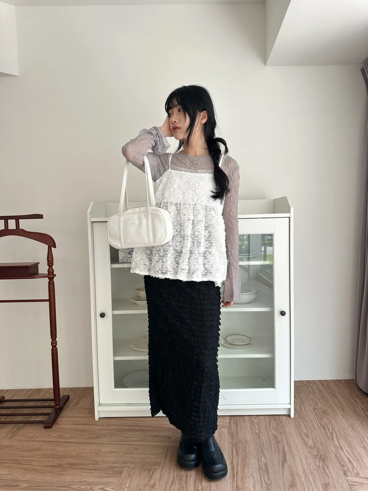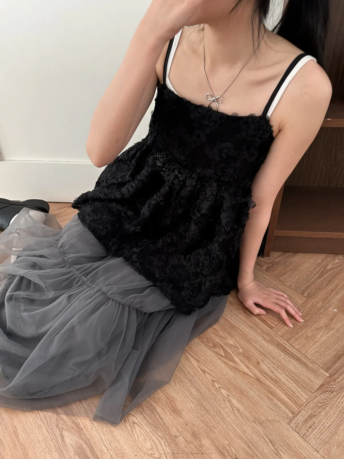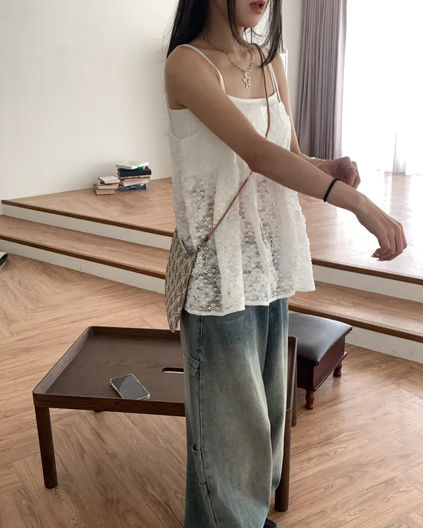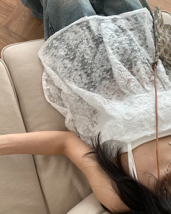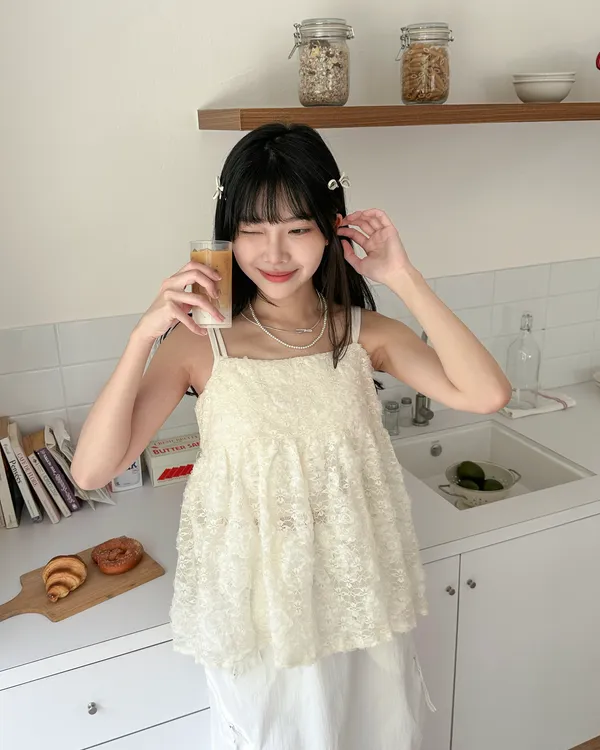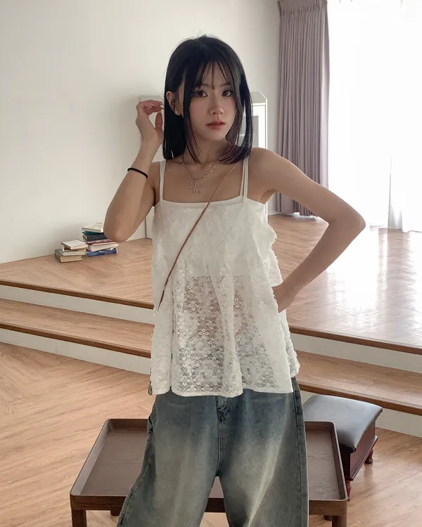 Model Size - F / 158cm, 42kg. / 161cm, 45kg.- Floral lace- Layering top- Airy doll cut