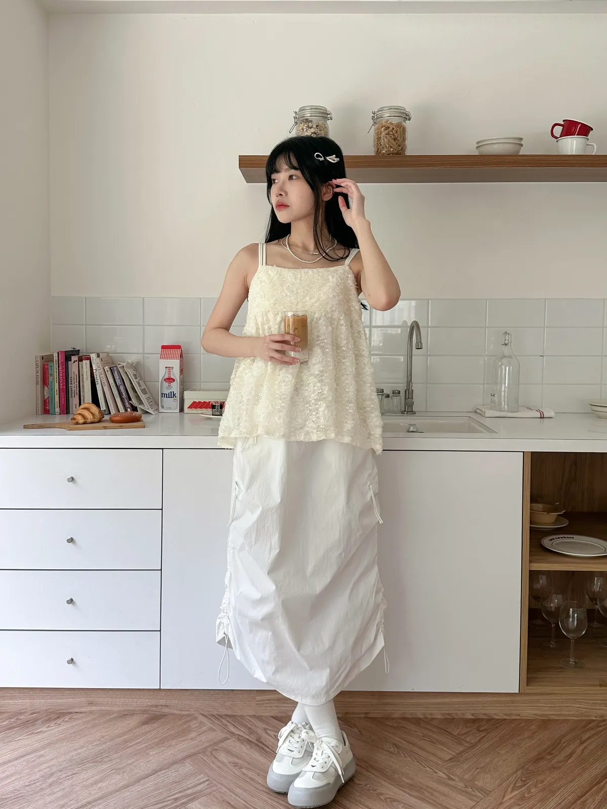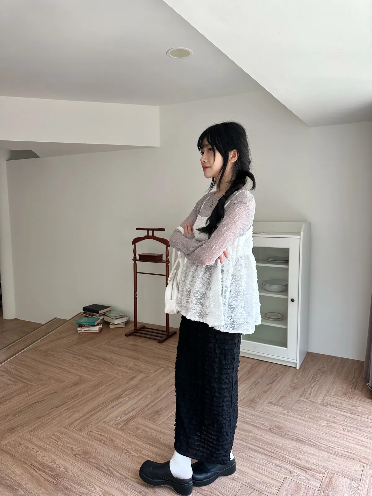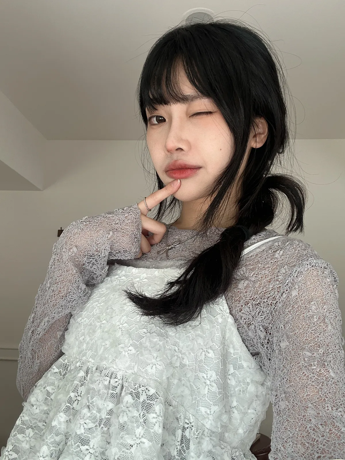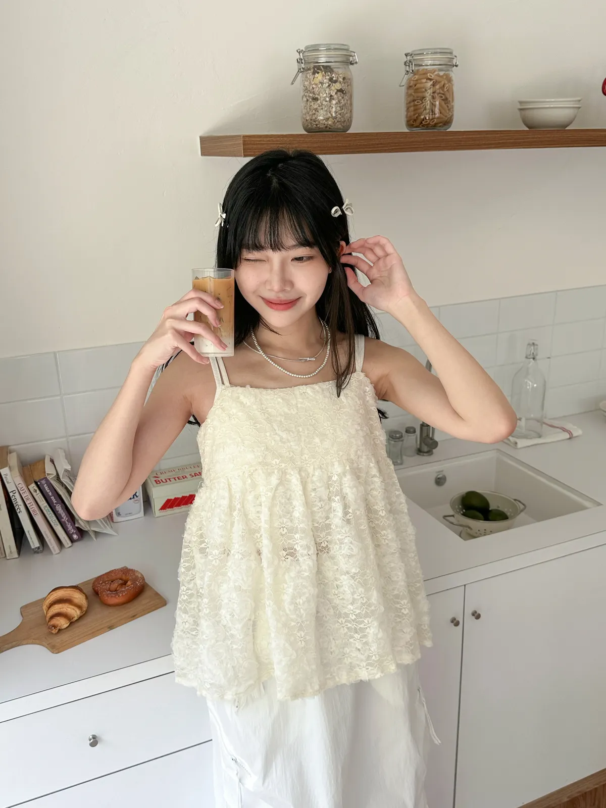 Model Size - F / 158cm, 42kg. / 161cm, 45kg.- Floral lace- Layering top- Airy doll cut