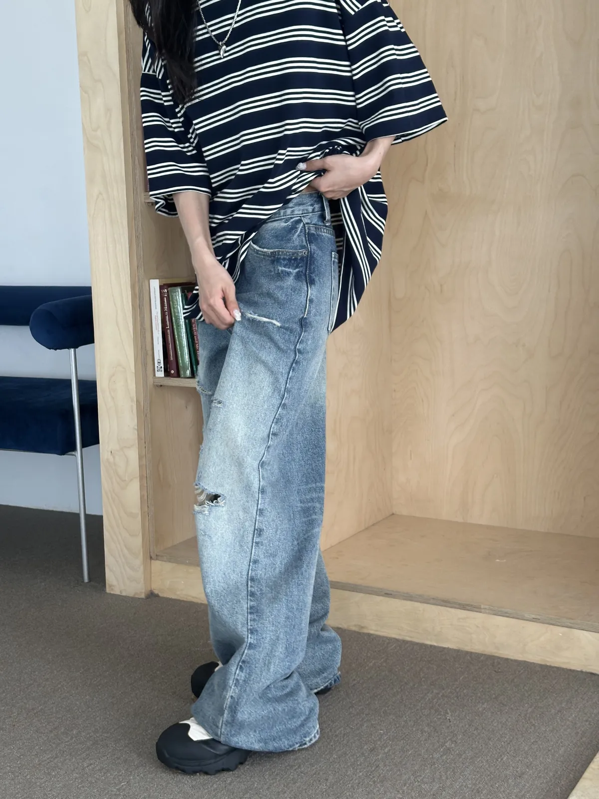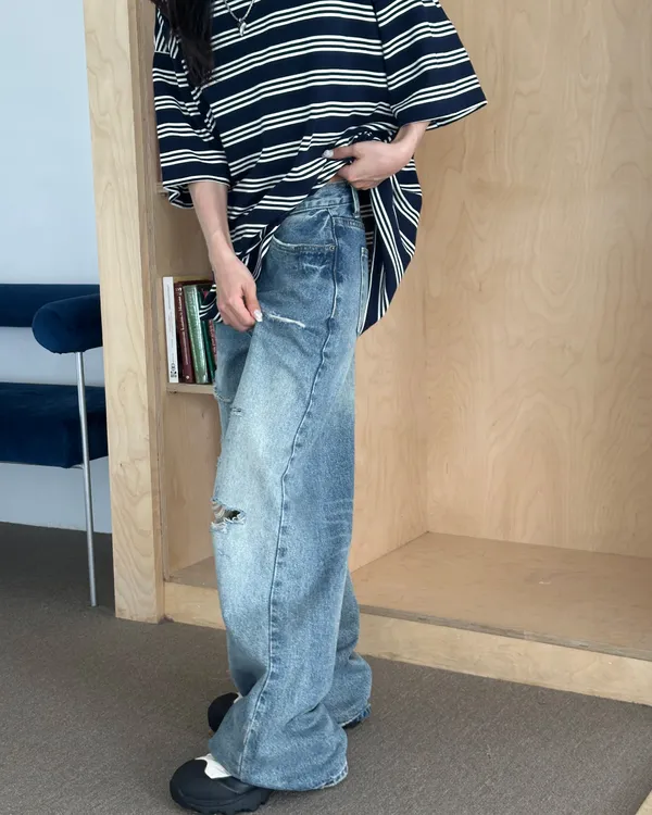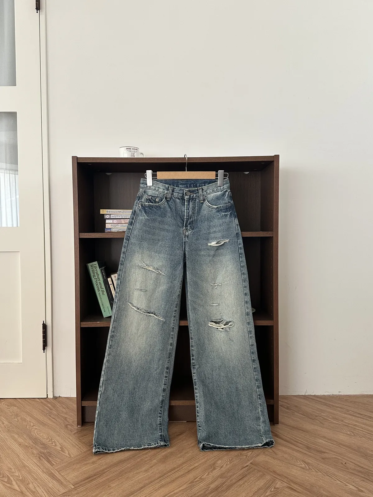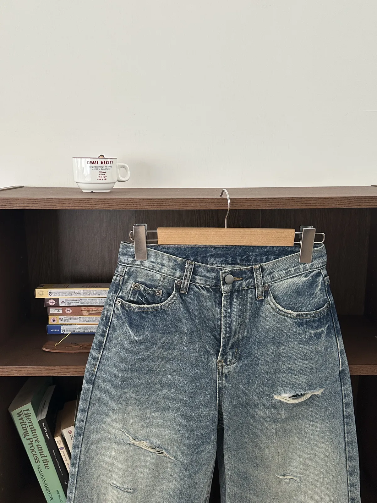Seoul vibes刷破設計 復古直筒牛仔褲-1col