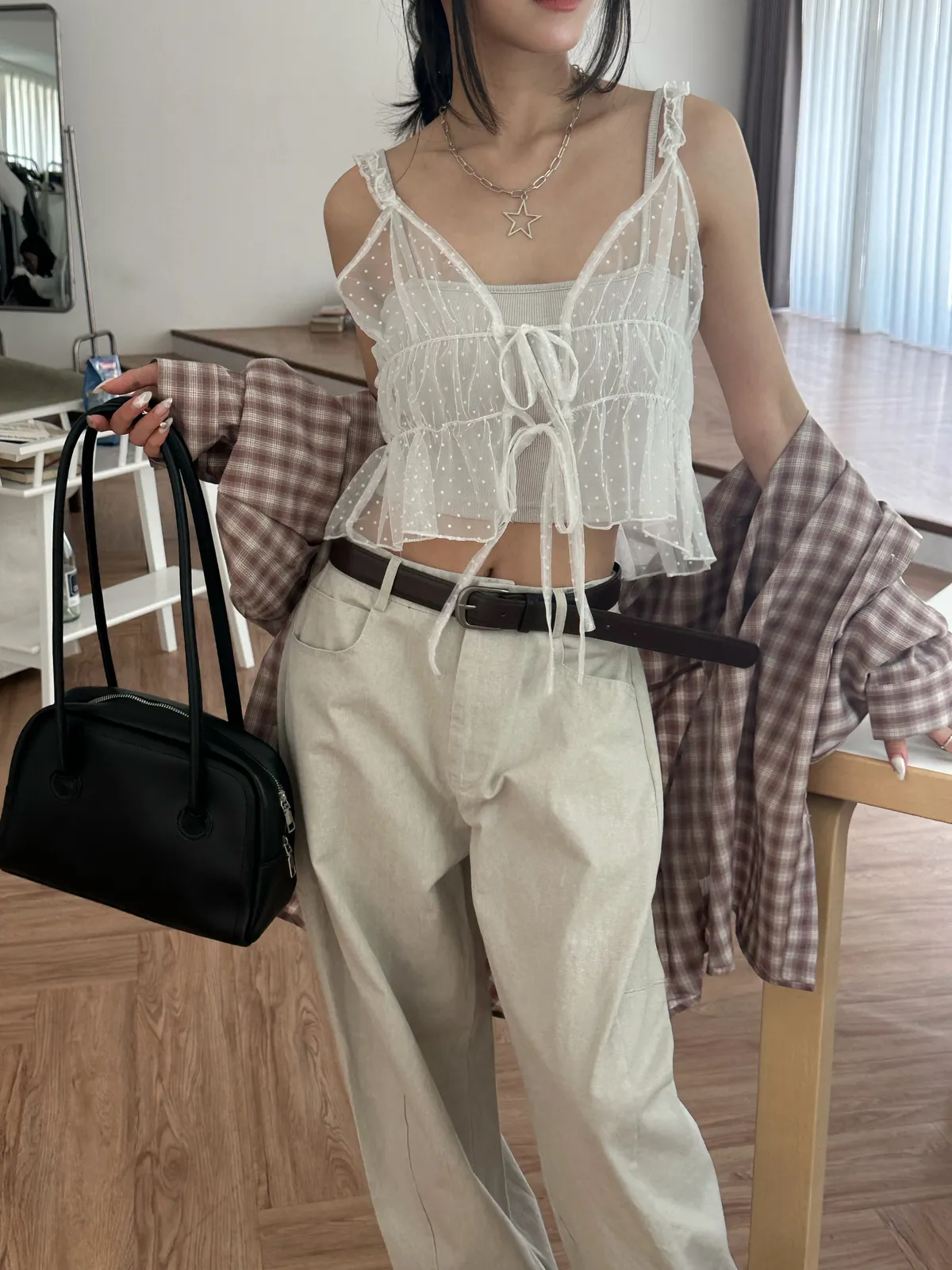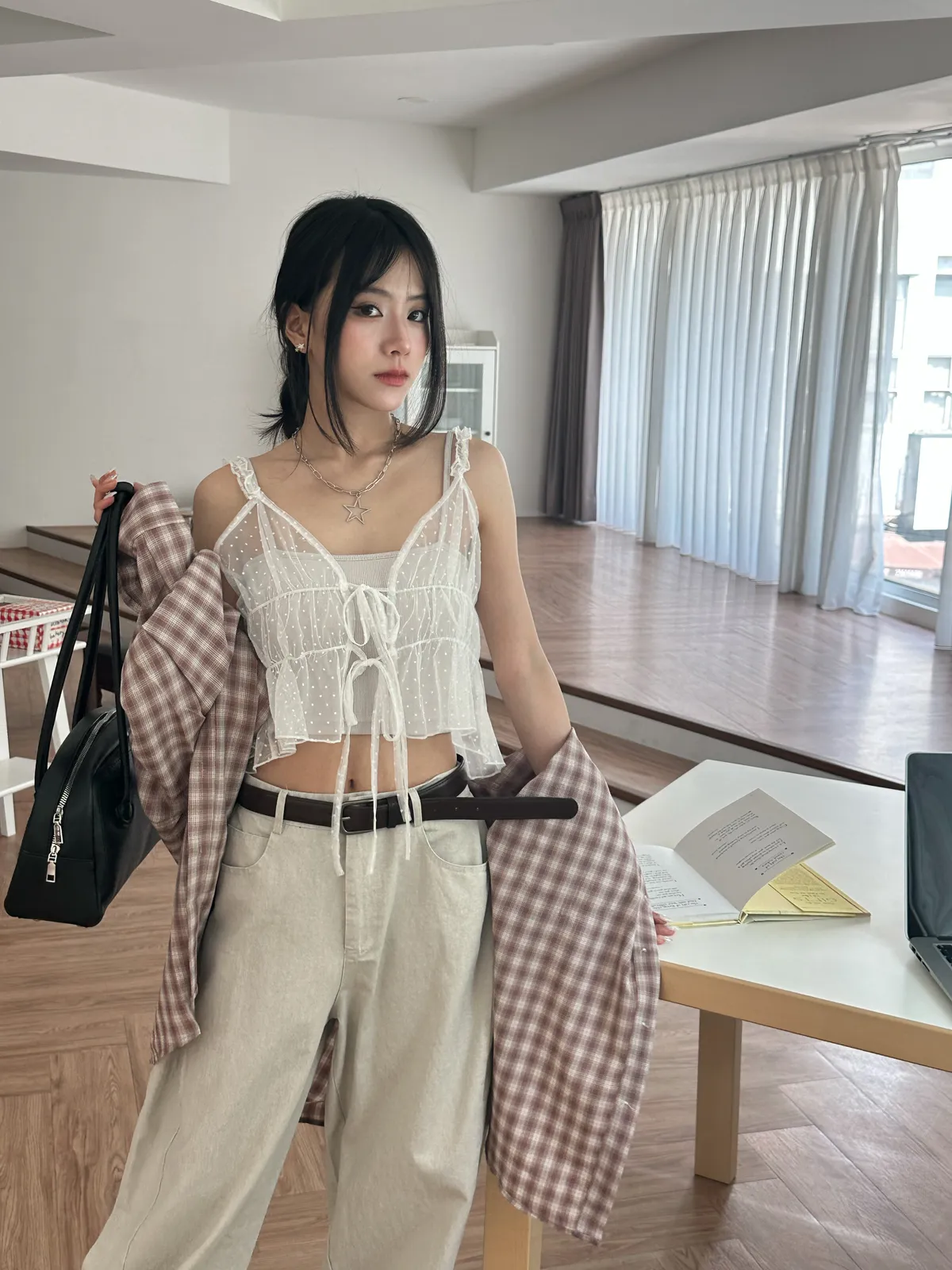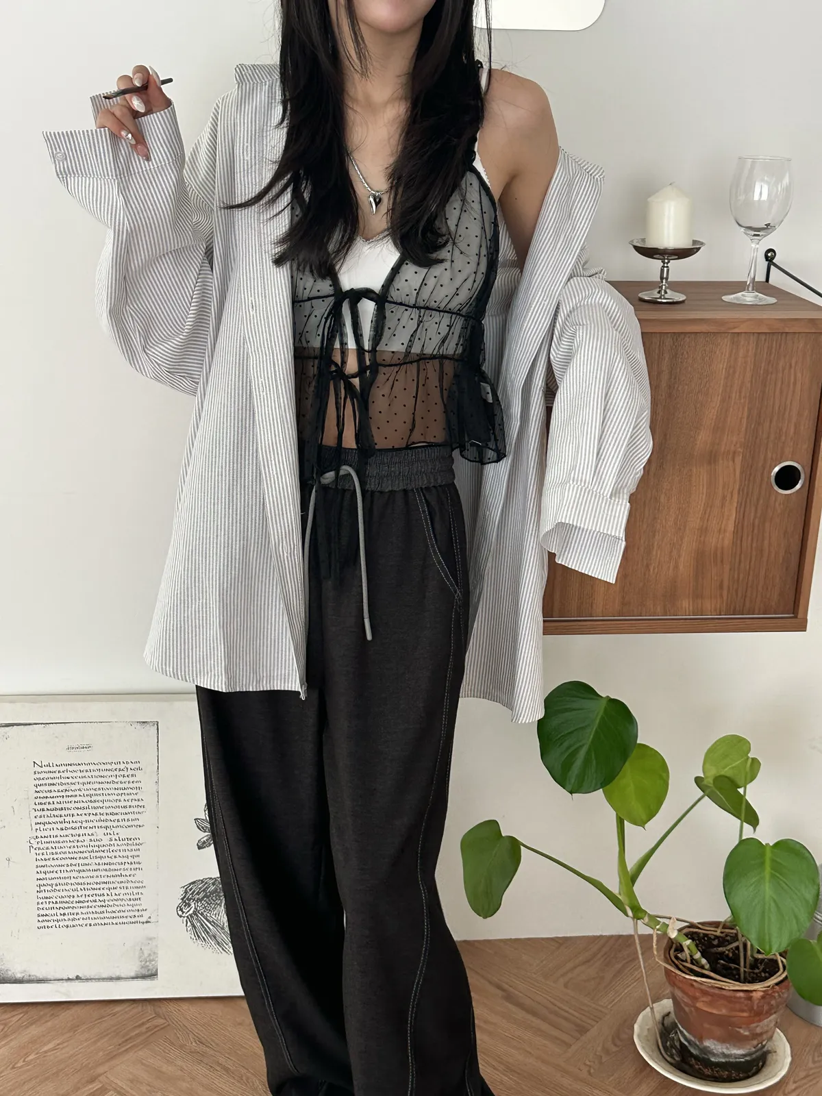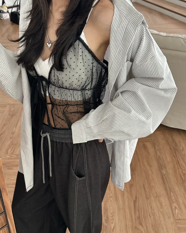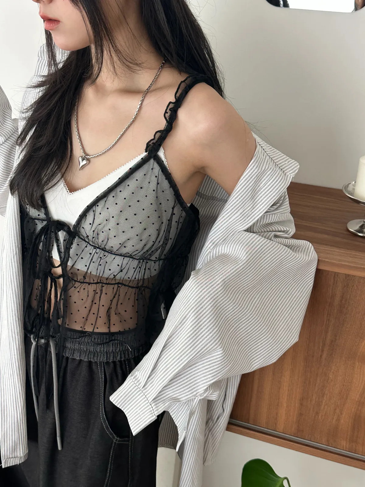 Model Size - F / 158cm, 42kg.- Ribbon tie- Mesh babydoll- See-through camisole