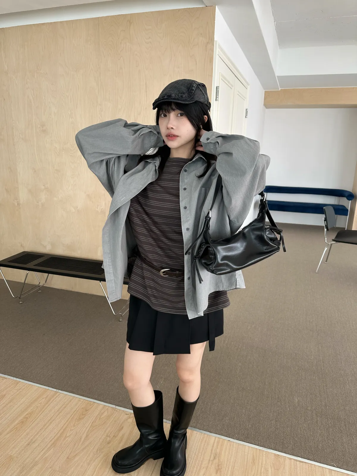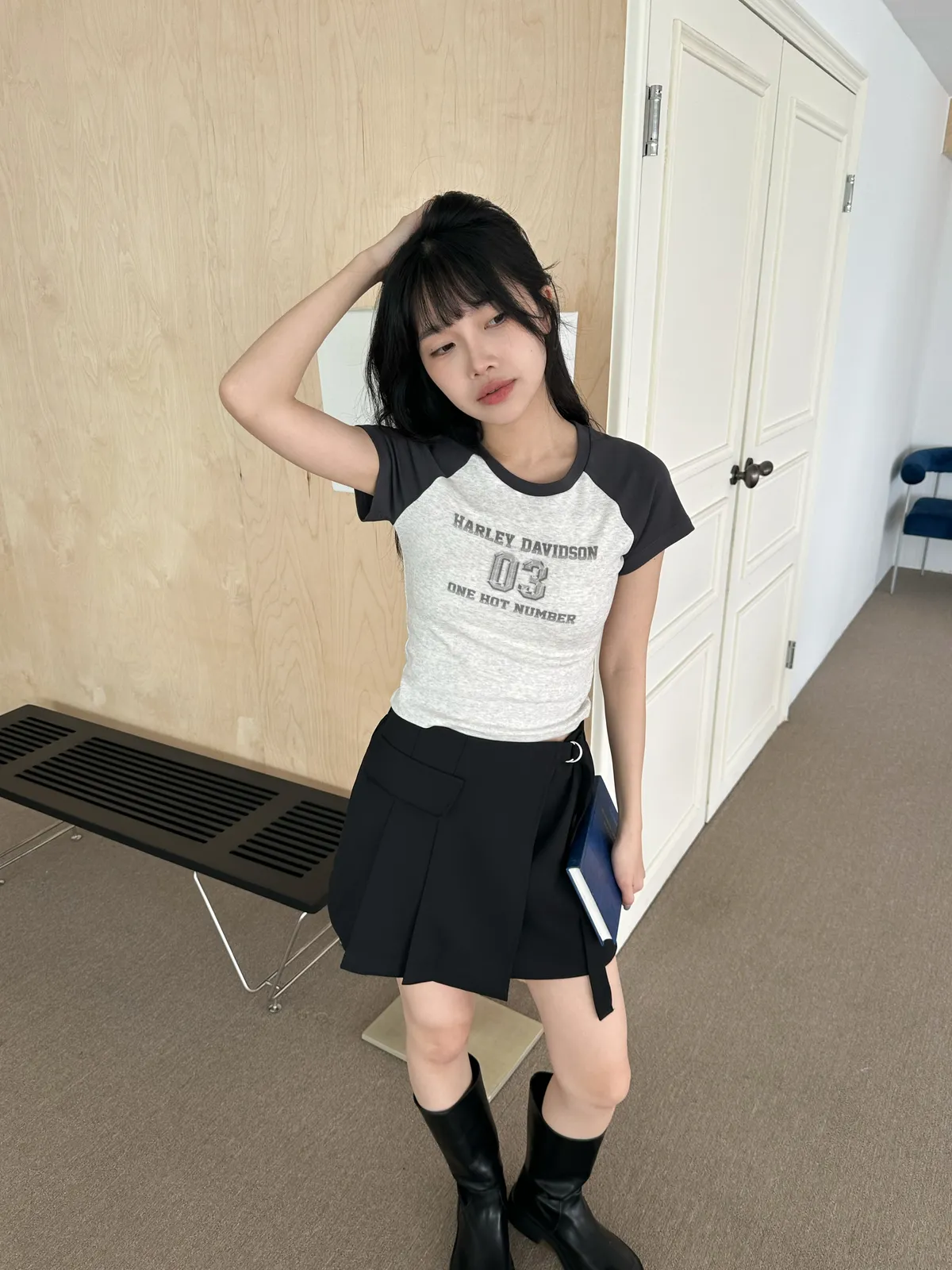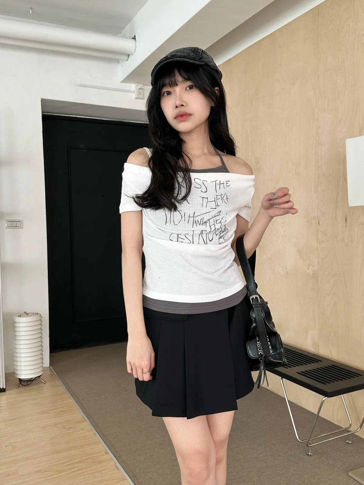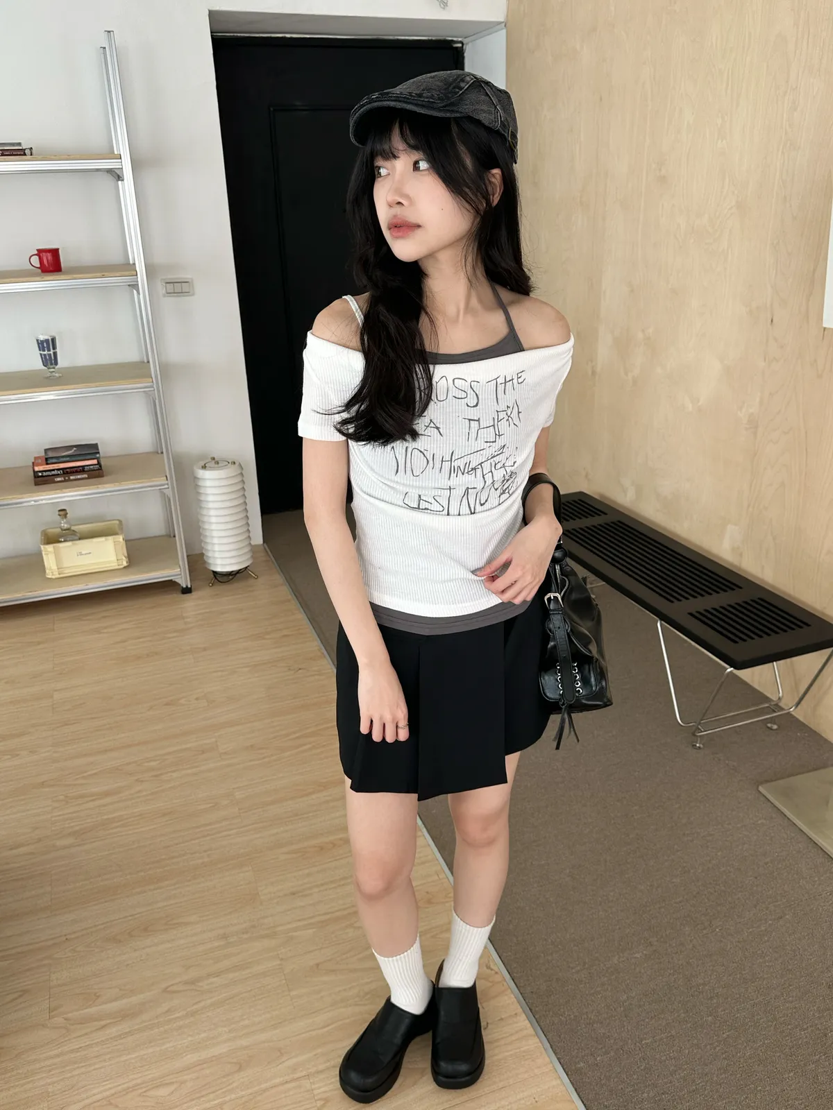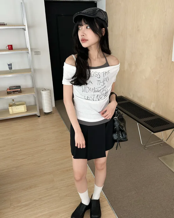 假兩件綁帶一字領上衣(4col)