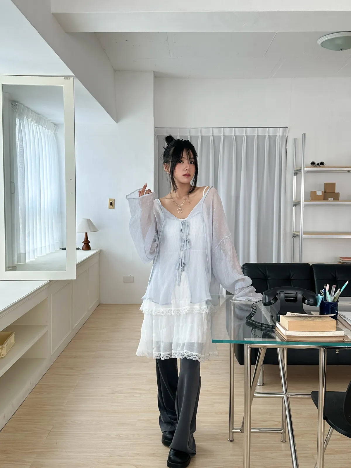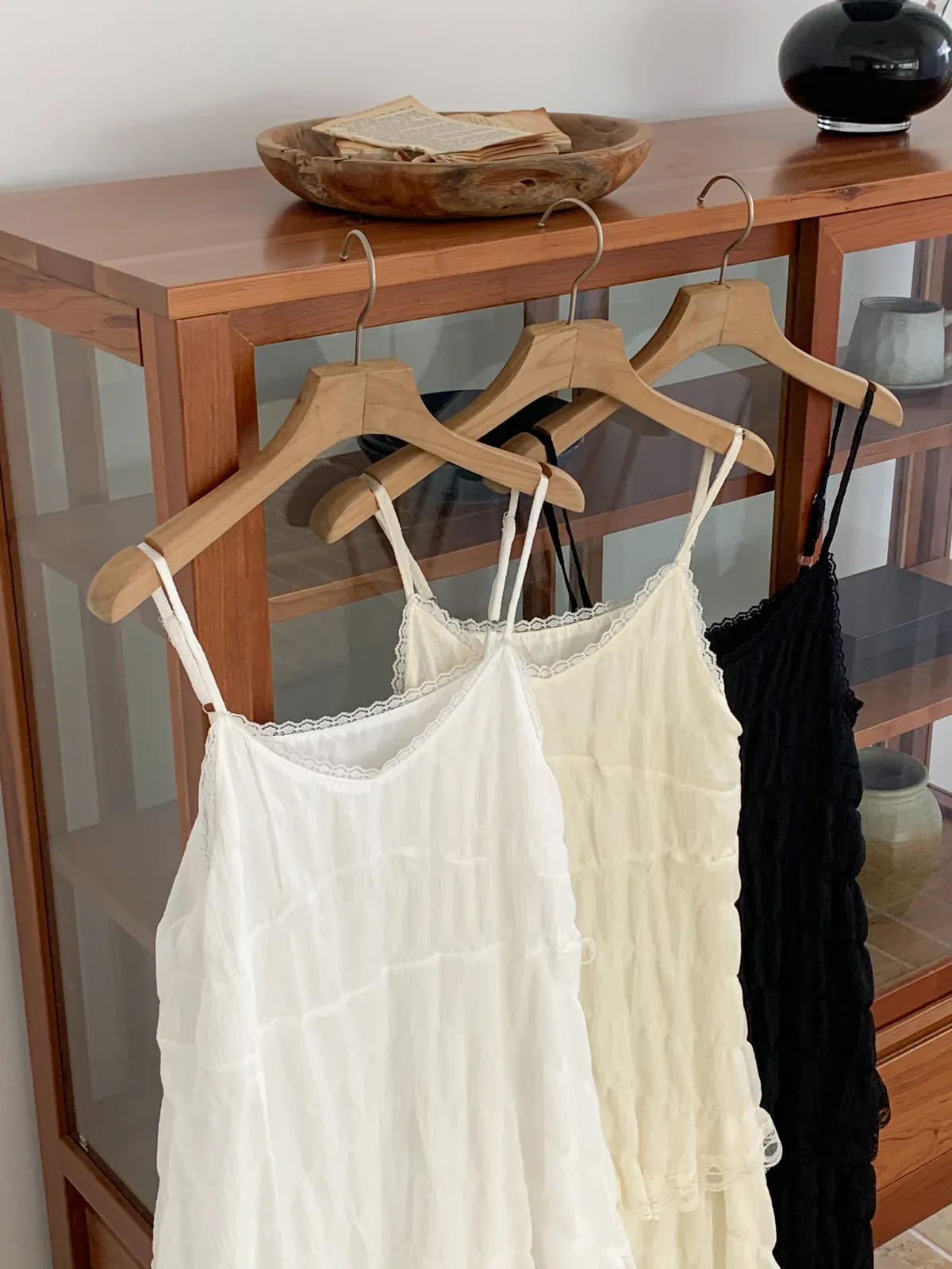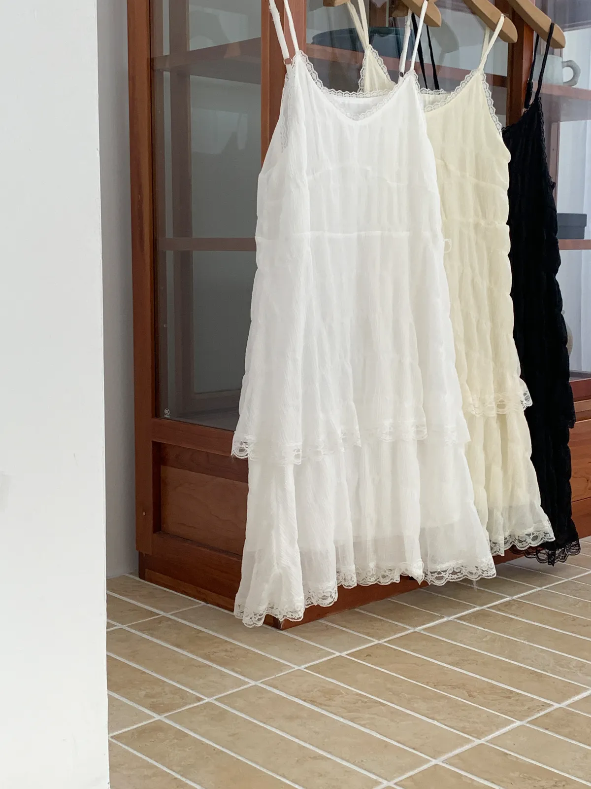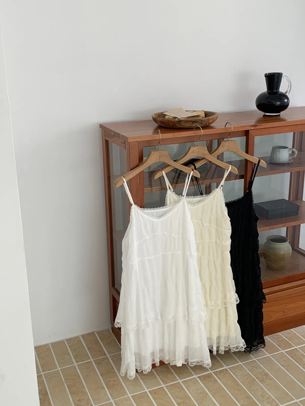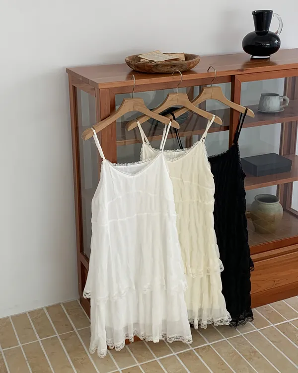 Model Size - F / 158cm, 42kg.- Tired ruffle- Mini dress- Lace-trimmed neckline