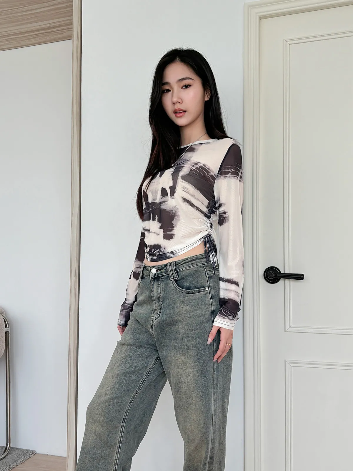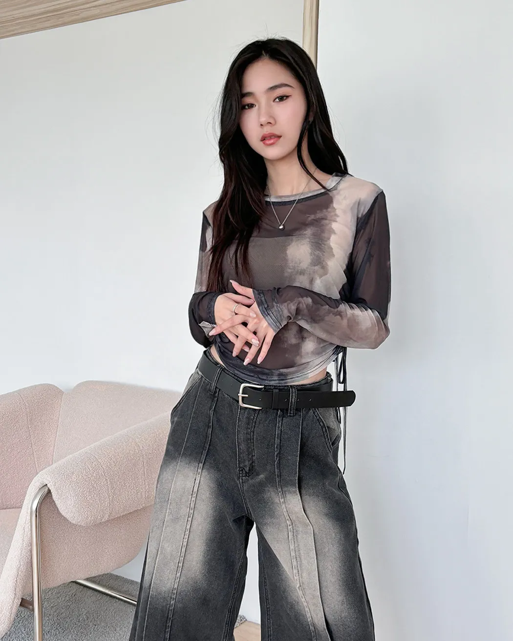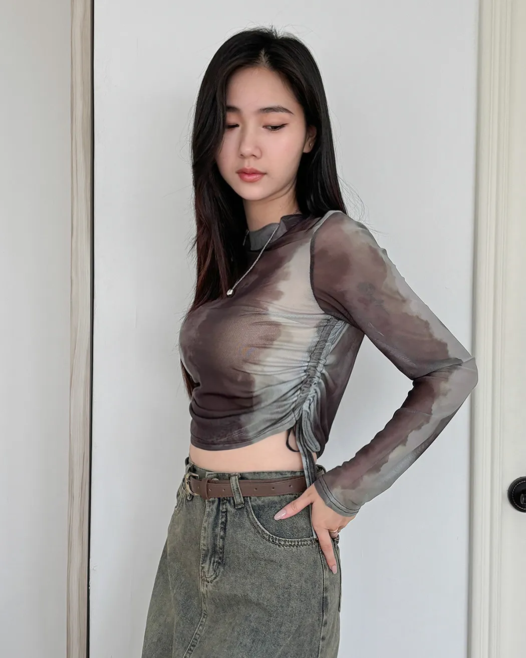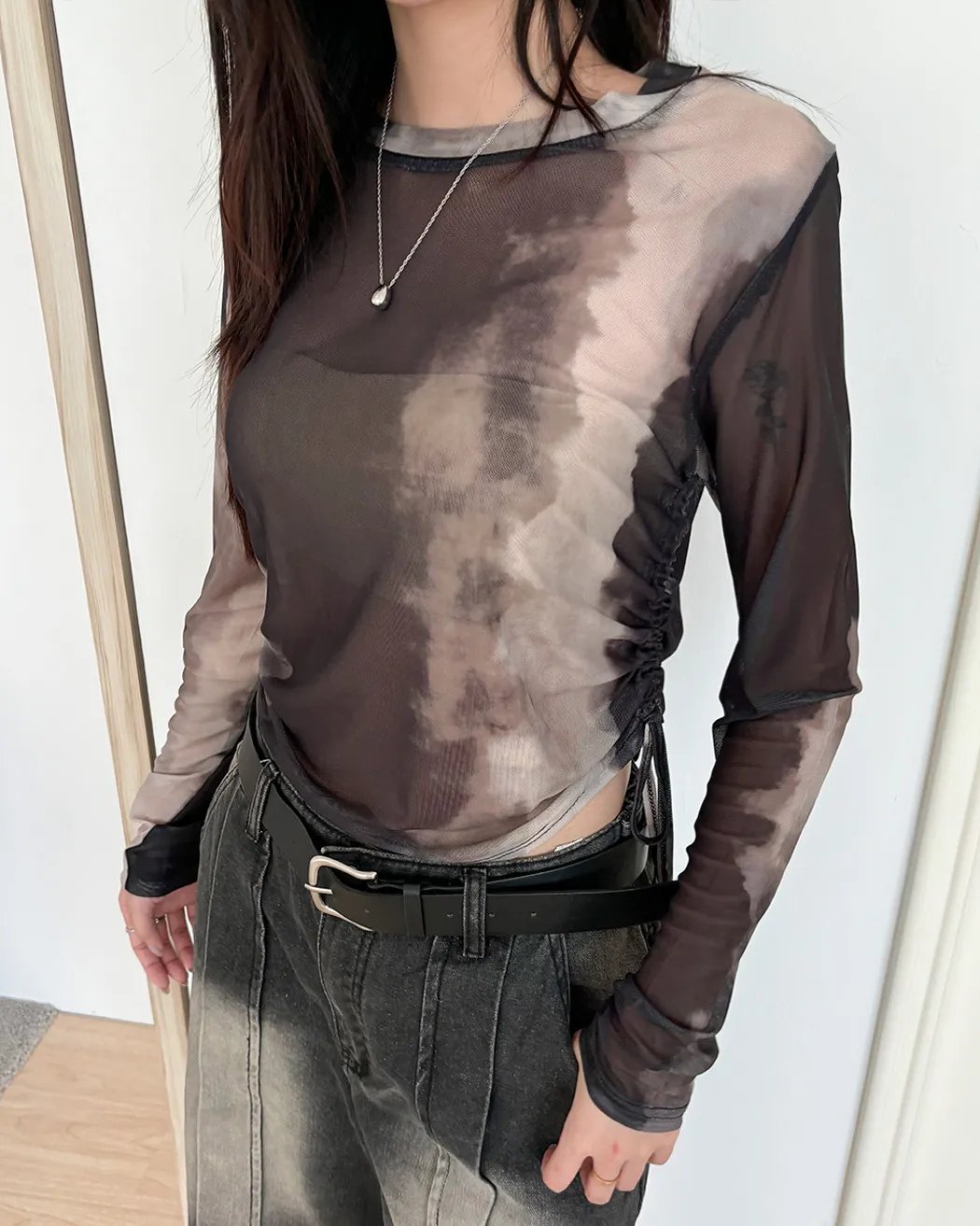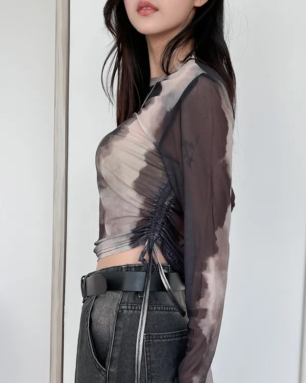 小眾設計款/渲染透膚抽繩上衣(4col)