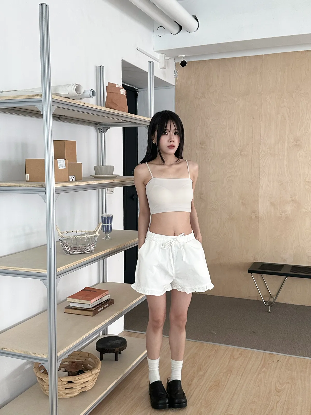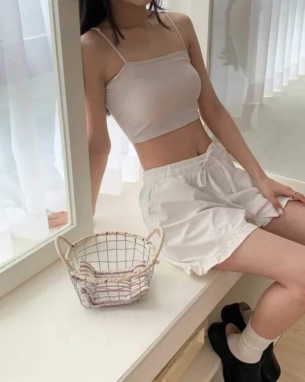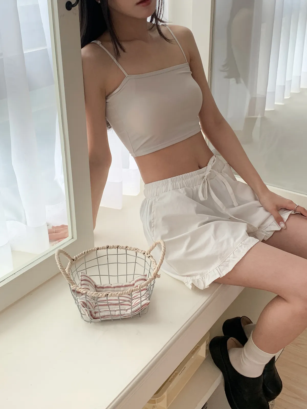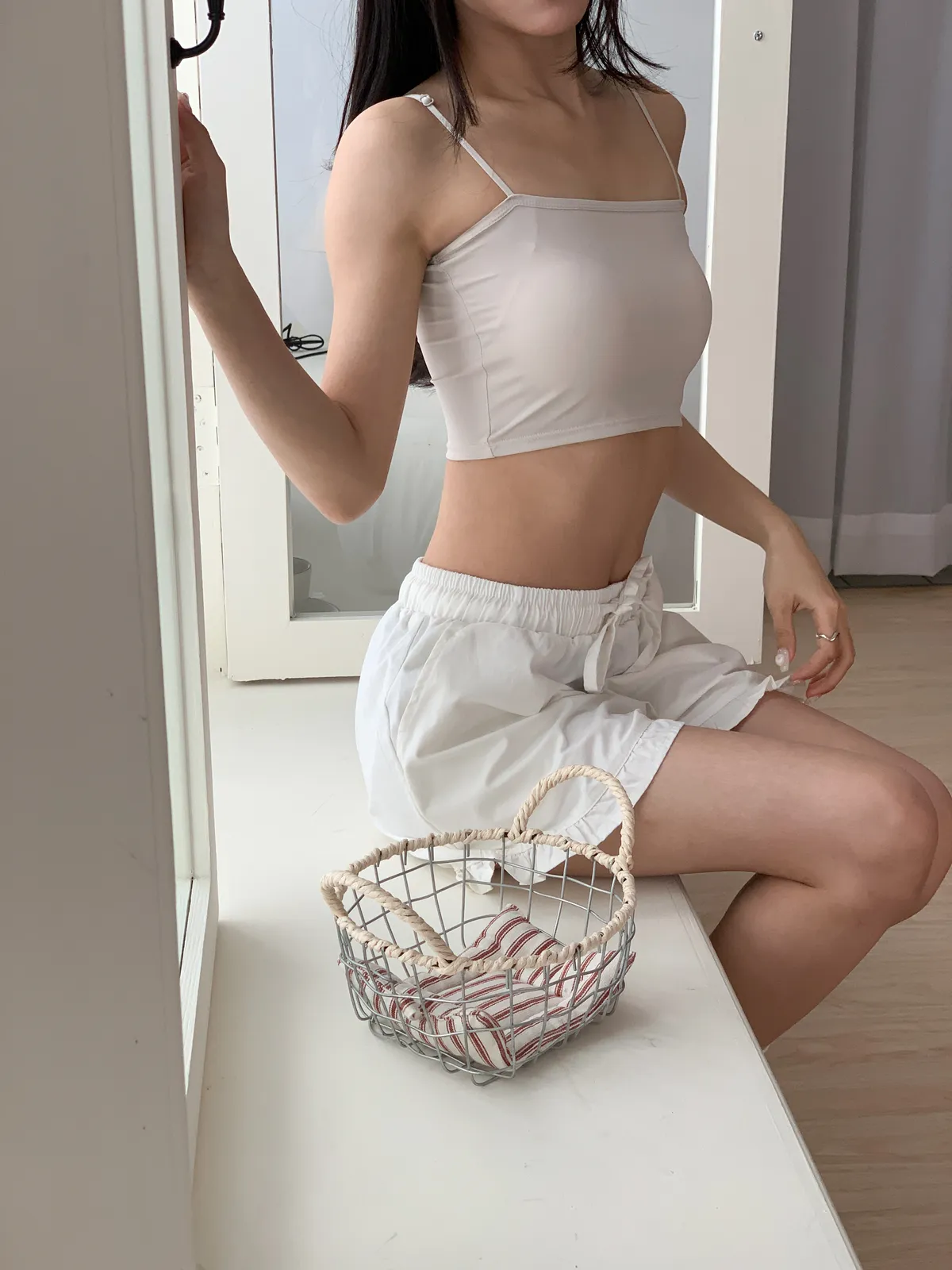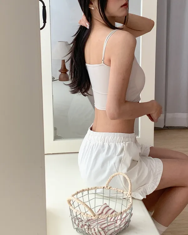 Model Size - F / 158cm, 42kg.- Cooling fabric- Sleek minimal desigh- Summer essential 白 杏 DETAIL VIEW